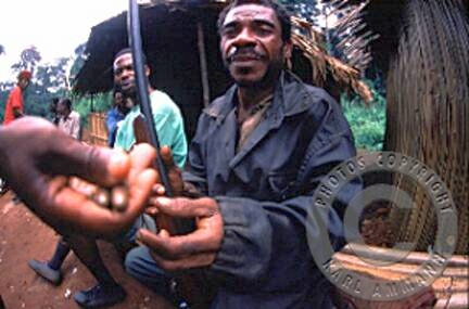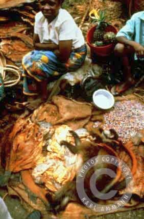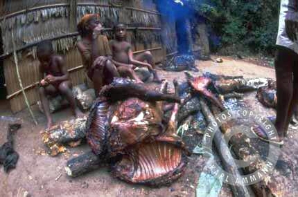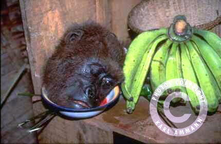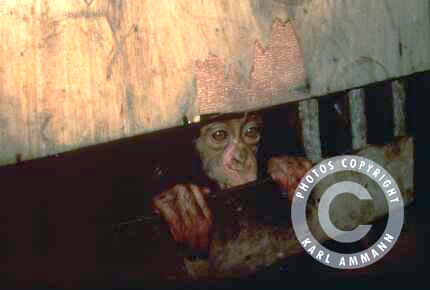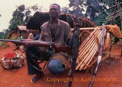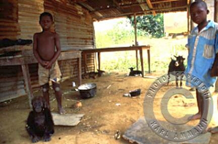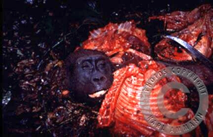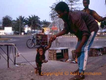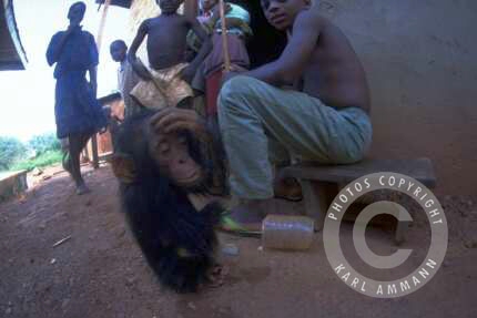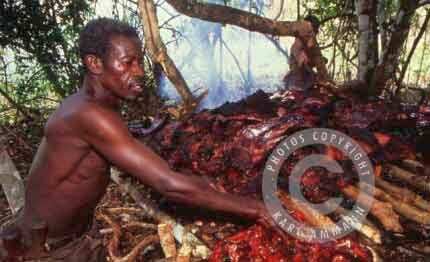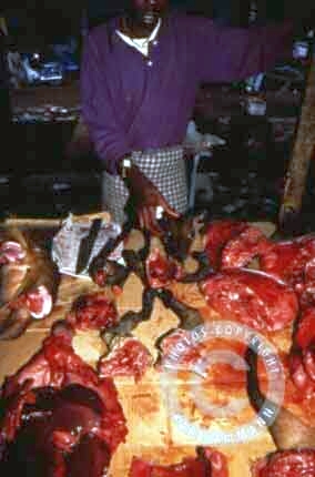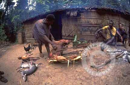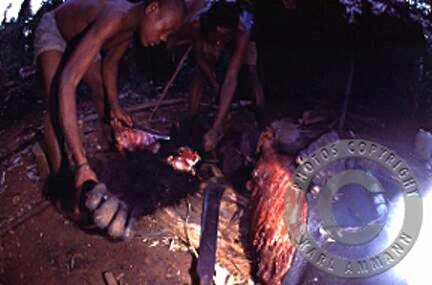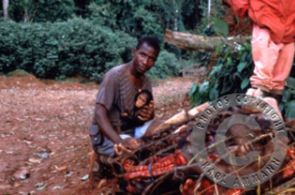 The bushmeat makes a lot of victims; apart form the killed and eaten animal and it’s family (mourning parents, abandoned offspring), there may be other impacted animals in the vicinity, and the people consuming the meat may be affected by deadly viruses (Ebola and HIV for example). The images below are not easy to look at but are part of a daily reality. You will see the hunting, transportation, preparation, marketing and selling aspects of this reality, but also some collateral victims: orphans and captive animals (who often times have witnessed their parents killed and butchered) and who will be eventually be killed, or will spend their lives in captivity.
